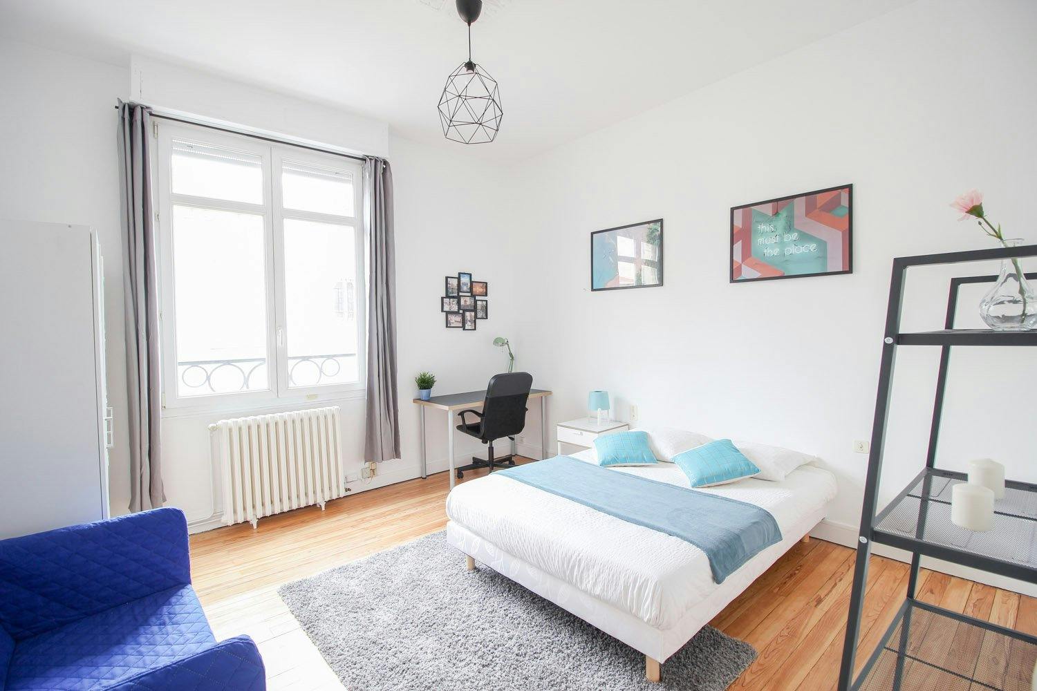 Grande chambre de 16m2, entièrement meublée. Elle dispose d’un lit double (140x190) accompagné d'une table de chevet avec lampe et d'un grand miroir en tête de lit. Un espace de travail est disponible, composé d'un bureau avec chaise et lampe. La chambre propose également plusieurs rangements : une armoire avec penderie et une étagère. La chambre dispose également d'un canapé. Situé dans le quartier Saint- Genès, cette maison de 163m2 bénéficie d’un emplacement idéal, à deux pas de l’Université de Bordeaux (Campus Carreire) et à proximité de toutes les commodités. L'appartement est composée de 6 chambres, une cuisine, une salle de bain, un WC séparé et un jardin. Toutes les pièces sont entièrement équipées et meublées. Le tout agencé et décoré avec soin. La cuisine est équipée d’électroménager neuf et de qualité. Elle contient, un réfrigérateur, des plaques de cuisson, une hotte, un four, un micro-onde, une machine à café, une bouilloire, un grille-pain et un lave-vaisselle. Un espace avec une table et des chaises est à disposition ainsi que divers rangements. La salle de bain dispose d’une baignoire, d’un lavabo et de rangements. Tous les équipements nécessaires pour le ménage (balai, serpillère, aspirateur) sont mis à votre disposition dans la maison ainsi qu’un lave-linge. Le loyer comprend une provision sur charges : électricité, eau, chauffage, internet et l'assurance habitation. Le logement est éligible aux APL (bail individuel). -- English version : Large room of 16m2, fully furnished. It has a double bed (140x190) accompanied by a bedside table with lamp and a large mirror at the head of the bed. A work area is included, composed of a desk with chair and lamp. The room also has storage space: a wardrobe with hanging space and a shelf. The room also has a sofa. Located in the Saint-Genes district, this 163m2 house benefits from an ideal location, close to the University of Bordeaux (Campus Carreire) and near all amenities. The apartment is composed of 6 bedrooms, a kitchen, a bathroom, a separate toilet and a garden. All rooms are fully equipped and furnished. The whole is arranged and decorated with care. The kitchen is equipped with new and quality appliances. It contains a refrigerator, cooking plates, hood, oven, microwave, coffee machine, kettle, toaster and dishwasher. A space with a table and chairs is available as well as various storages. The bathroom has a bathtub, sink and storage space. All the necessary cleaning equipment (broom, mop, vacuum cleaner) is available in the house as well as a washing machine. The rent for the room includes a provision for charges: electricity, water, heating, internet and home insurance. The accommodation is eligible for APL (individual lease).