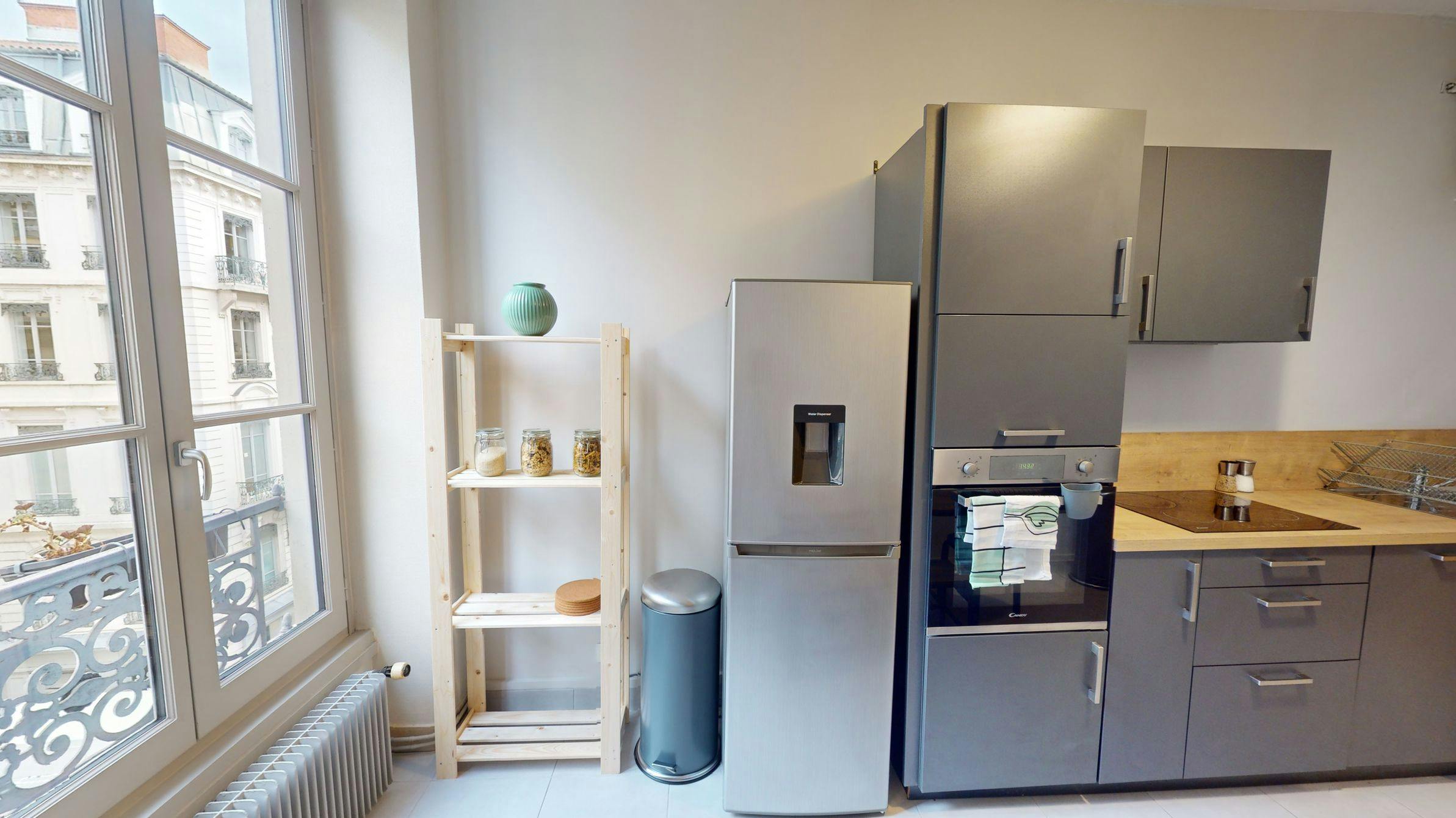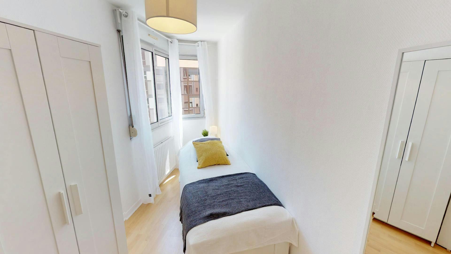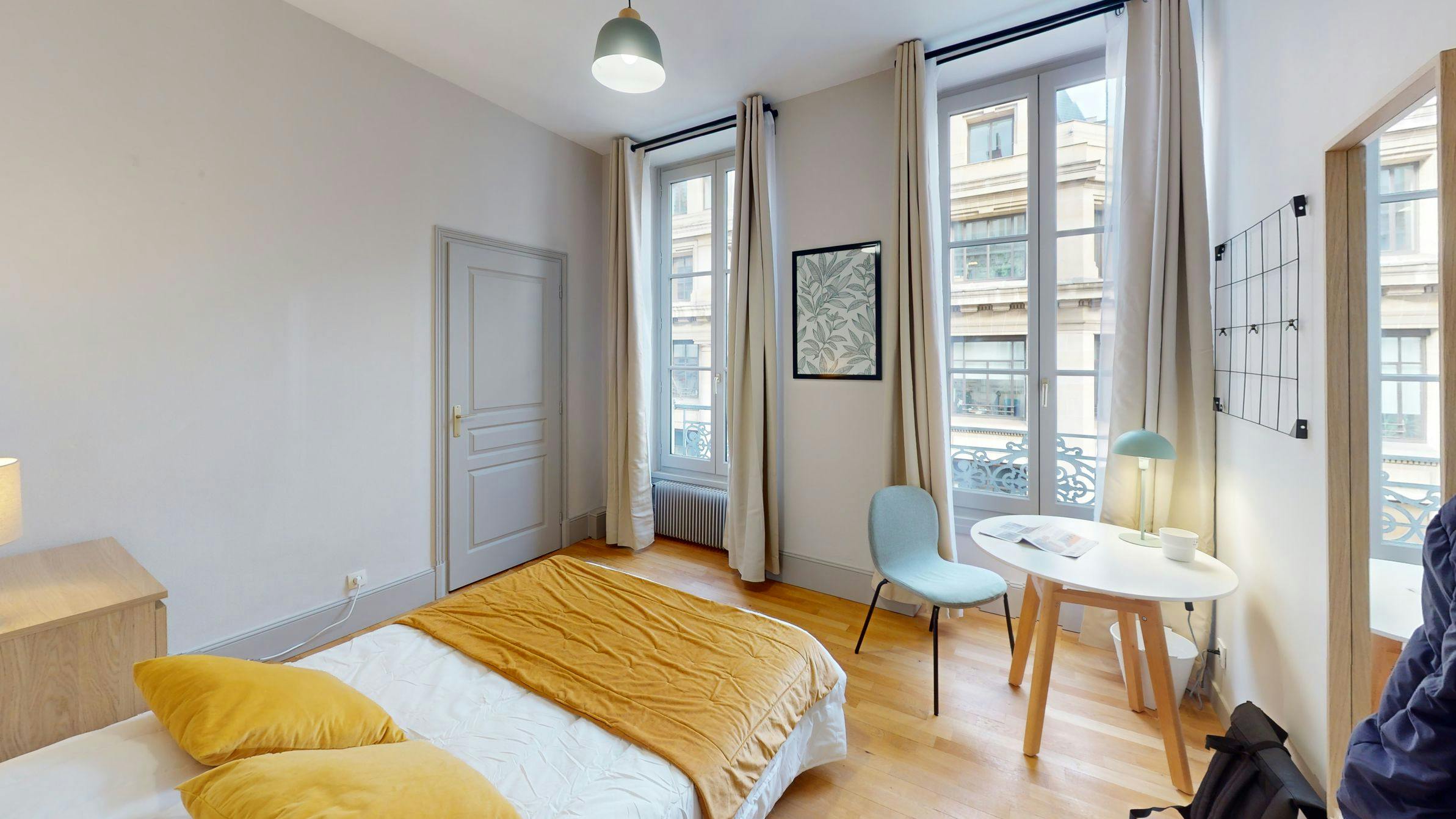 This lovely private bedroom in a fully equipped, furnished and all-inclusive flatshare in Lyon is a mix of comfort and design. It has got household furnishings, including a bed with pillows and duvet What is missing is your things to feel at home! The room can be locked if you need intimacy. The flatshare can be found in the Bellecour - Presqu'île neighborhood, in the heart of Lyon. Plenty of shops, public transports, restaurants are accessible close by. The apartment is on floor 5 with lift. It is entirely equipped and is composed of a large kitchen with refrigerator, microwave, pans, crockery, kitchen ustensils, kettle... The accommodation also contains an ironing board, a washing machine, a clothes rack, an iron. Additionally, you will find cleaning items in the accommodation: bagless hoover, dustpan and brush, broom, mop and bucket... Every Joivy furnished flatshare includes all expenses: housing insurance, water, electricity, unlimited wi-fi, condominium fees, household waste tax. Current tenants: 1: 25, Female, Worker 2: 20, Male, Student 3: 21, Male, Student Please be aware that HousingAnywhere is an online booking platform. Therefore exchanging contact details and offering viewings is not possible. If you would like to reserve this accommodation, send me a booking request or a message and please mention your age and occupation. I look forward to talking to you! CONTRACT Please, note that to all our listings we apply fortnightly contracts. This means that If you check-in during the first half of the month, you will be charged for the full month. If you check-in during the second half of the month, you will only be charged for the second half. The second half of the month starts on the 16th. If you check-out during the first half of the month, you will only pay until the 15th of that month. If you check-out during the second half of the month, you will be charged the full month.