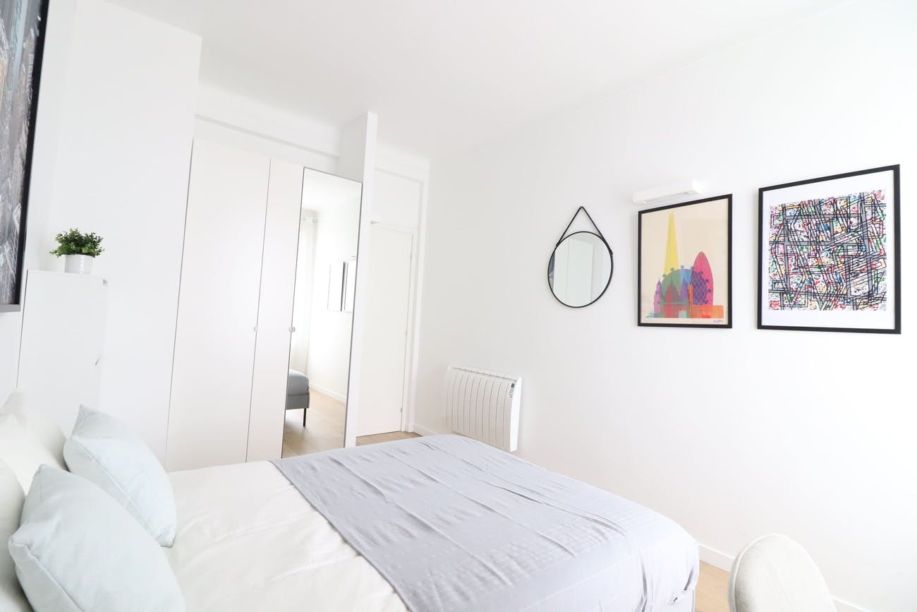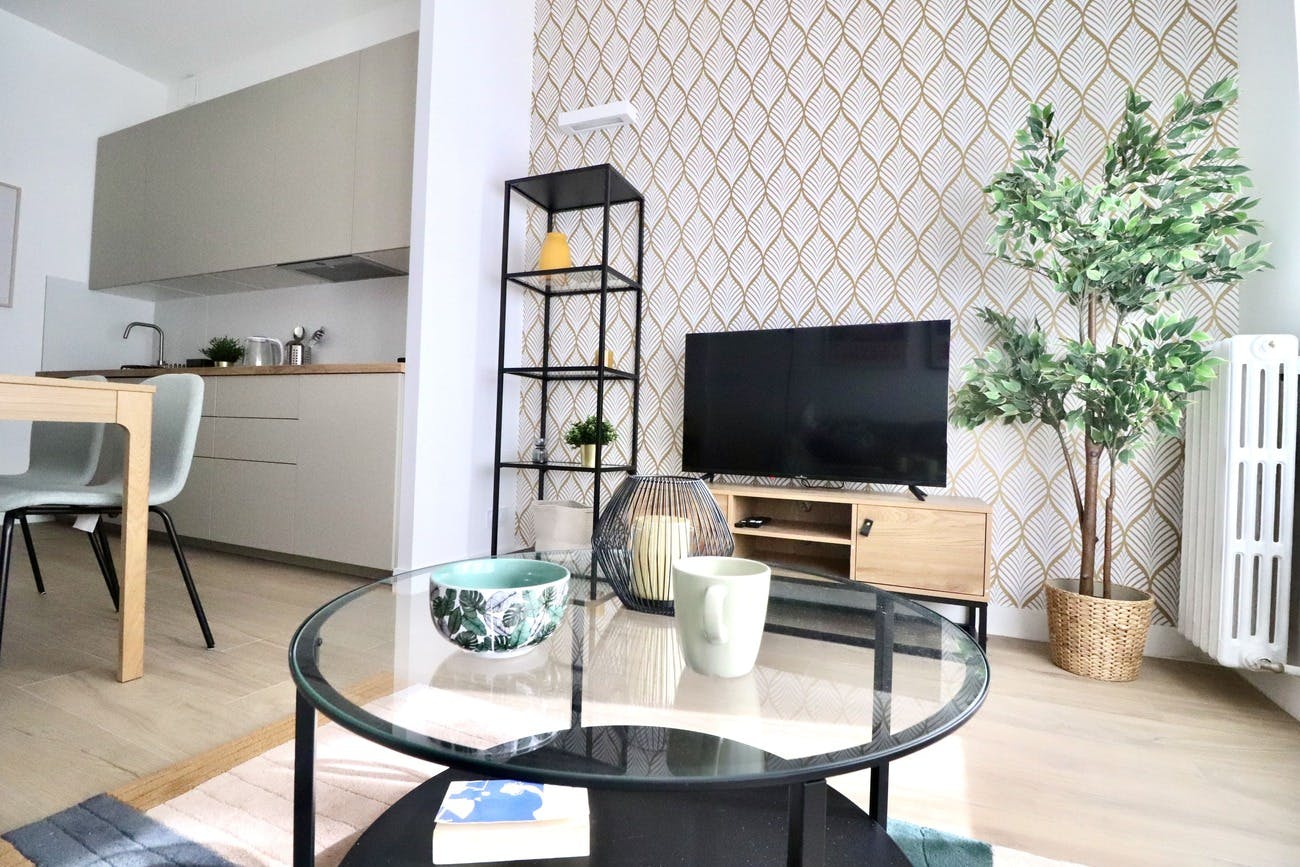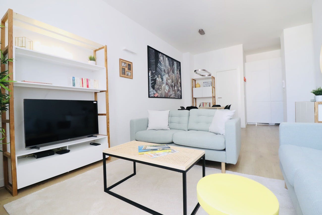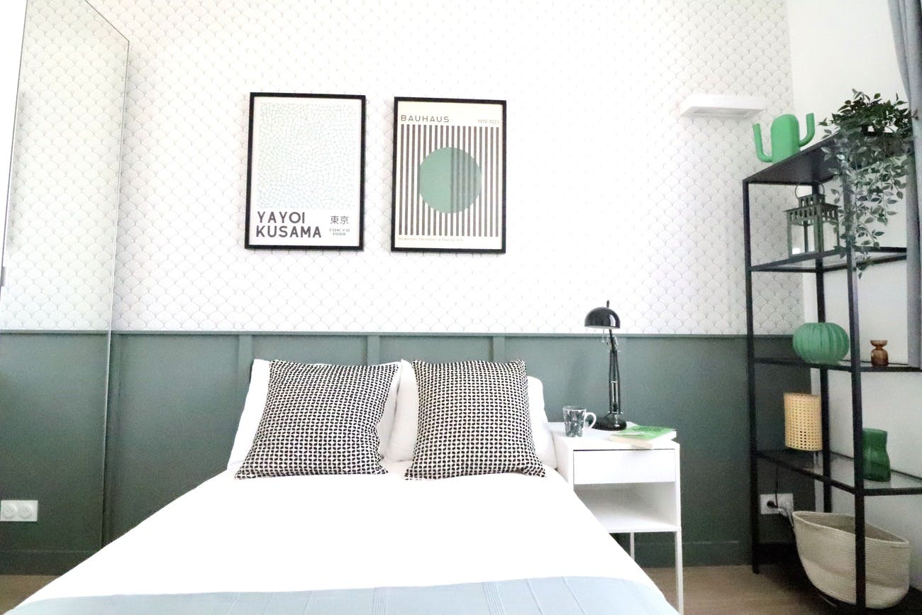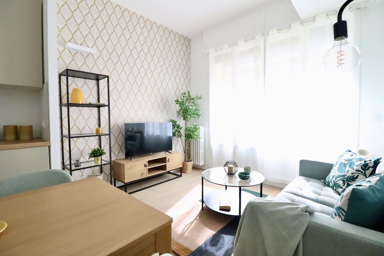 A beautifully designed apartment on the 5th floor of an Art Deco building. The apartment features four bedrooms, two bathrooms, and a spacious living room with an open kitchen. Designed in a contemporary style with bright tones and warm textures, it offers a welcoming atmosphere. Each room is fully furnished with a double bed, ample storage, a desk, and tasteful decor. Modern amenities include a fully equipped kitchen, large TV, washer, dryer, and dishwasher. Ideally located near Riquier Station, it provides quick access to Monaco and central Nice. Carrefour TNL is just a two-minute walk away for convenient shopping. Rent includes building charges, bi-monthly cleaning, internet/TV, water, and an electricity provision (adjusted annually). A one-time fee covers lease setup, inventory, and assistance. APL eligible—see the CAF website for details.