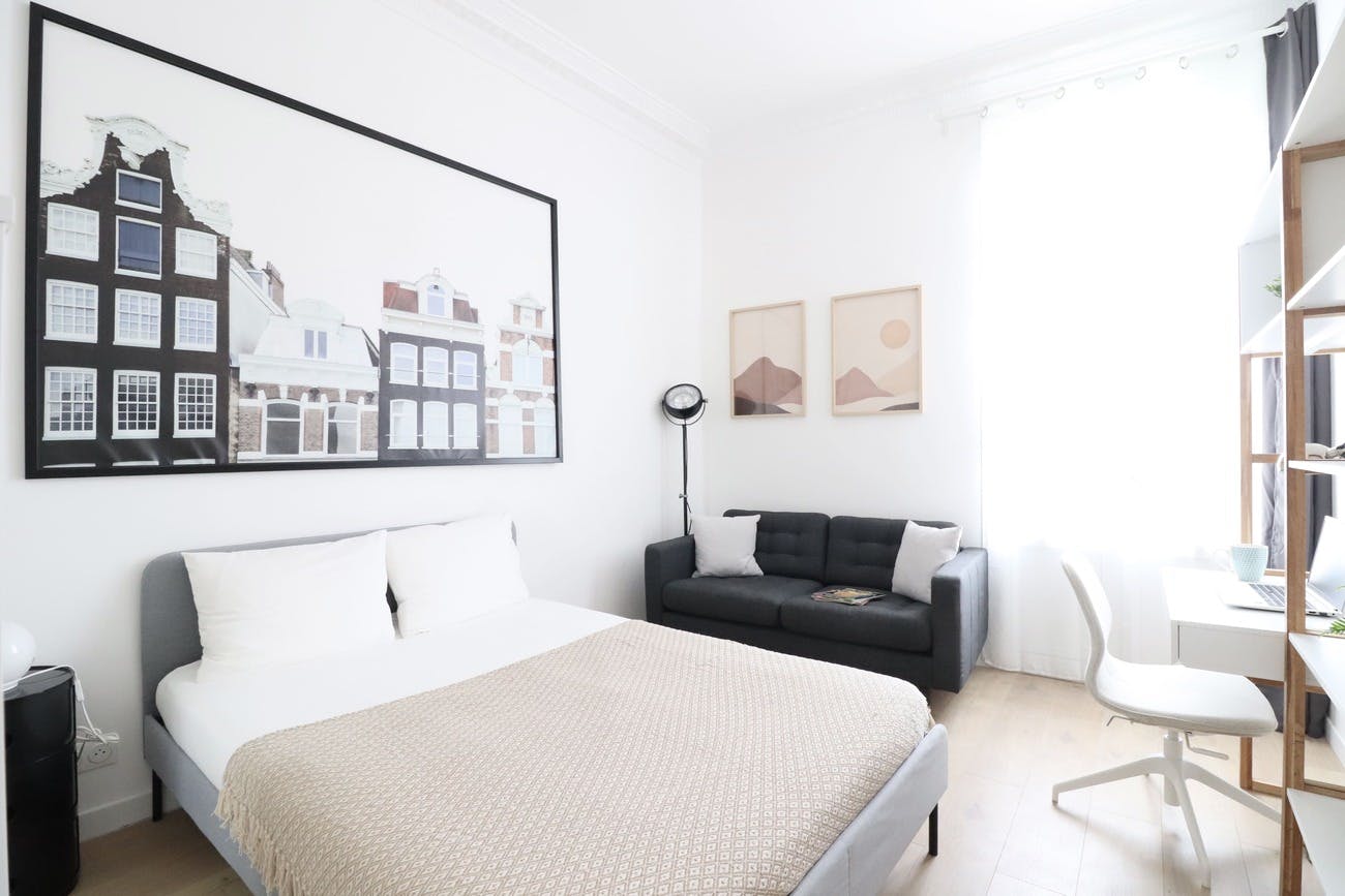Experience the comfort of this stylish apartment at 70 Rue de France in Nice, just a two-minute walk from the Promenade des Anglais and the beach. It features a bright living area with an open kitchen, five fully furnished bedrooms, two bathrooms, and a convenient storage space. Designed by interior experts, it blends contemporary style with classic Riviera charm. Each bedroom includes a double bed, desk, storage, and shelving for personal touches. Perfectly located in central Nice, the apartment offers easy access to groceries and public transport, with a supermarket across the street. Rent includes building charges, bi-monthly cleaning, internet/TV, water, and an electricity provision (adjusted annually). A one-time fee covers lease setup, inventory, and assistance. APL eligible—see the CAF website for details.